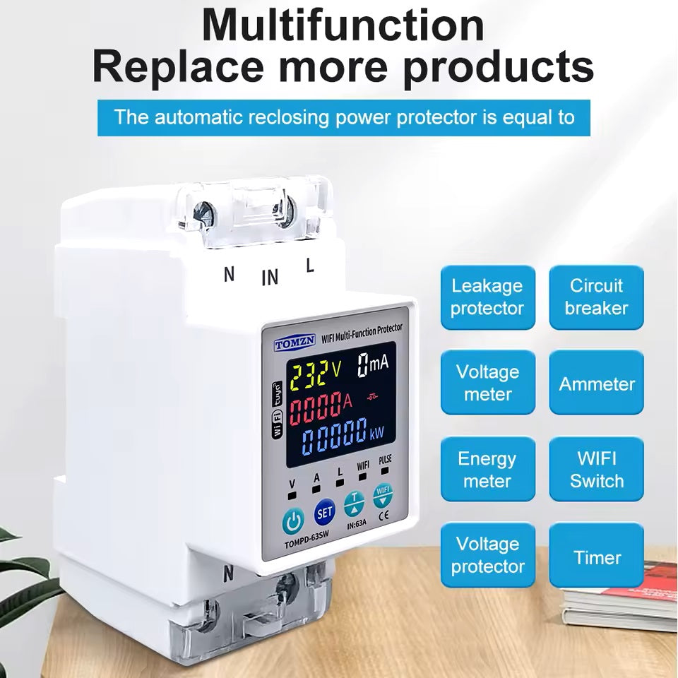 - TOMPD-63SW 63A 220V TUYA WiFi Circuit Breaker. Timer with Leakage Current and Voltage Protection. TOMPD-63SW 63A 220V TUYA WiFi Circuit Breaker. Timer with Leakage Current and Voltage Protection.